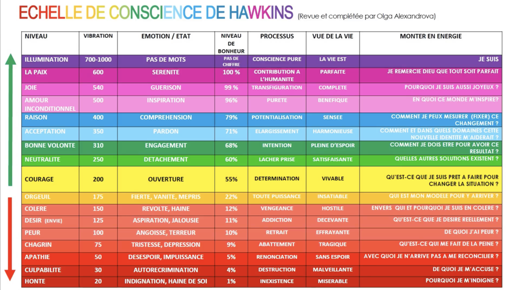 👉 Plus nous nous élevons sur l’échelle de conscience de Hawkins, plus nous accédons à la paix intérieure, à la liberté émotionnelle et à une plus grande lucidité dans nos choix de vie.